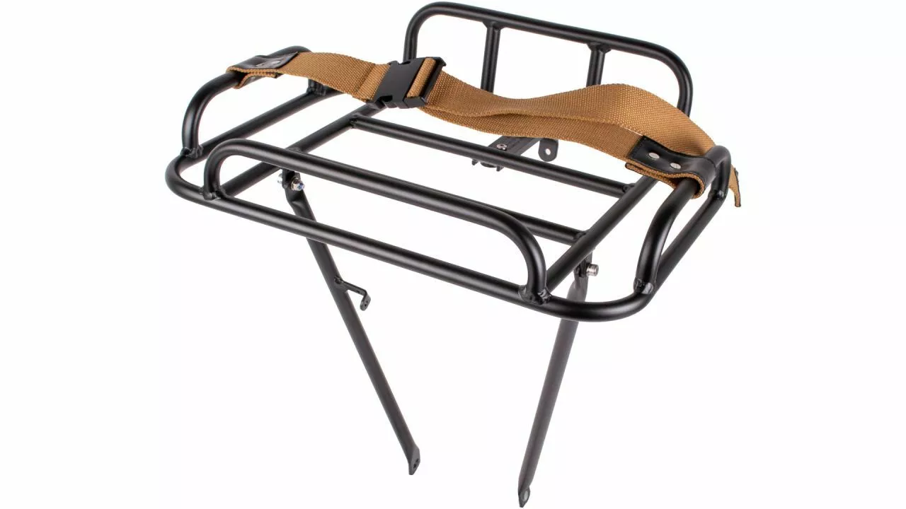Der Cargo Extra Vorderrad-Gepäckträger von ATRANVELO kann bis zu 10 kg Extra-Ladung an 26'' und 28'' Rädern mitnehmen. Vor dem Lenker wird er unten an der Achse und oben an der Gabel befestigt. Die Ladefläche, die sich aus den pulverbeschichteten 14 mm-Alu-Rohren ergibt, hat die Maße 44 x 33,55 cm. Die Seitenränder sind 7 cm hoch. Praktisch ist der seitliche Scheinwerferhalter. Gewicht: 1.045 g.