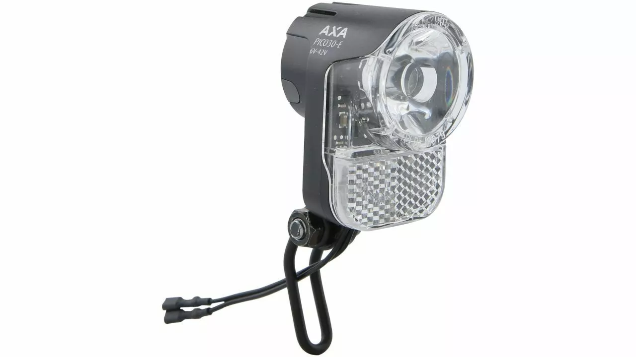 Beim Pico 30E von AXA handelt es sich um ein Mini-Power-Paket mit einer Beleuchtungsstärke von 30 Lux. Der Scheinwerfer ist mit E-Bike-Akkus mit einer Betriebsspannung von 6 bis 42 V kompatibel. Dabei ist sein kompaktes und schlankes Design für sportliche Fahrräder ein Gewinn. <br><br>Die Leuchte bietet einen integrierten Retroreflektor und eine optimale Lichtverteilung. Beide Funktionen steigern Ihre Sicherheit, da Sie mit ihnen für den entgegenkommenden Verkehr besser sichtbar sind und selbst eine gute Sicht haben. Sie selbst sehen 50 m weit und sind für andere auf eine Entfernung von bis zu 3 km zu sehen.<br><br>Ferner ist der robuste Edelstahlbügel dieses Scheinwerfers für jeden Straßentypen geeignet. Man kann ihn auch durch einen Bügel zur Integration an den gängigen Vordergabeln ersetzen.