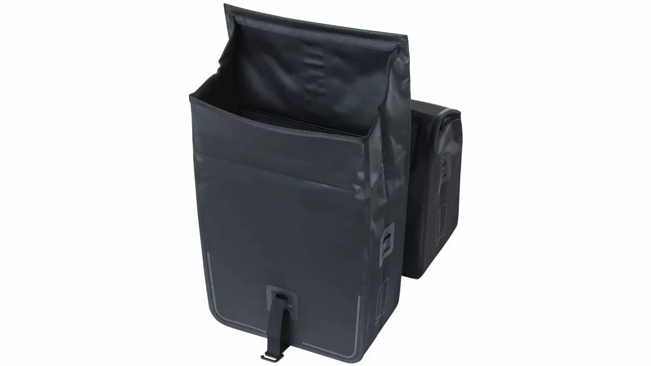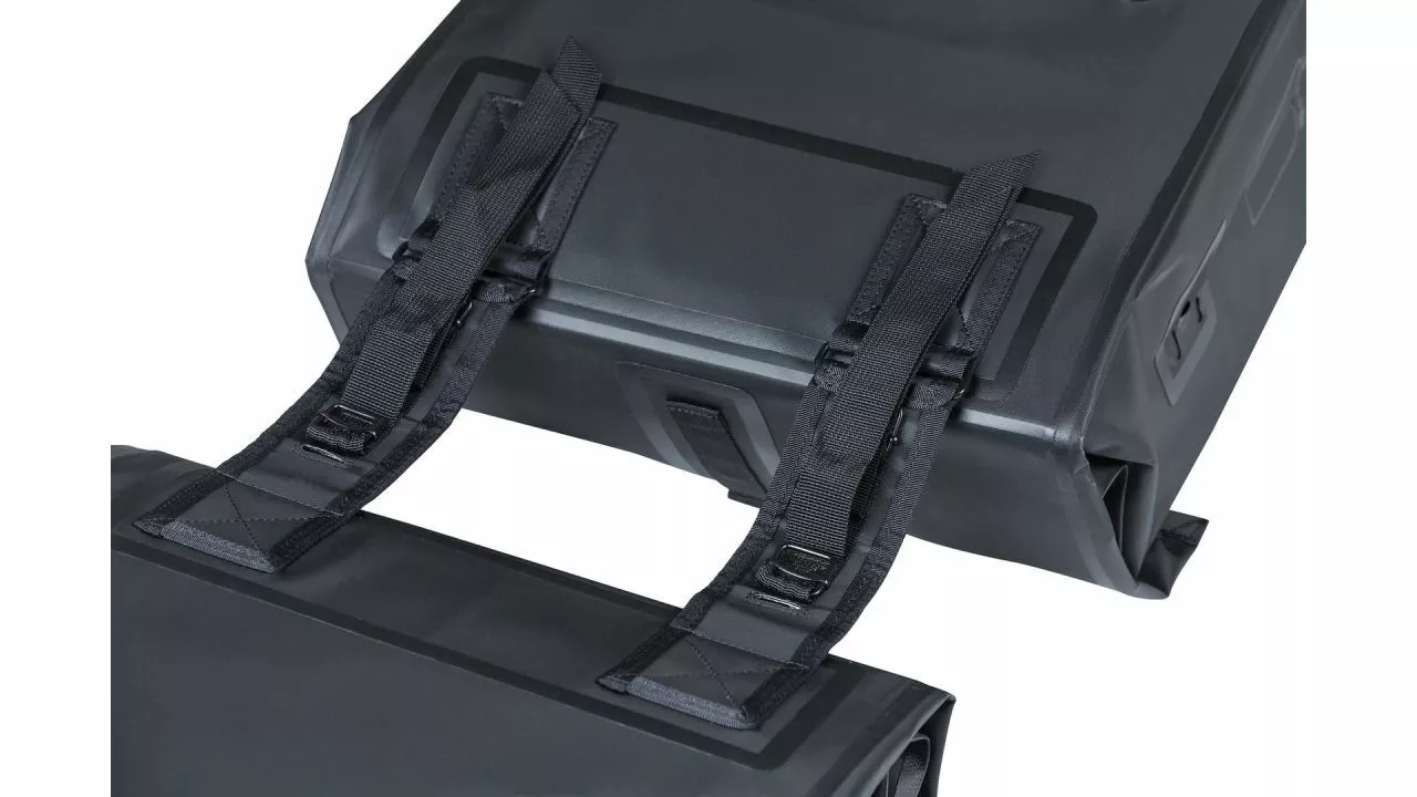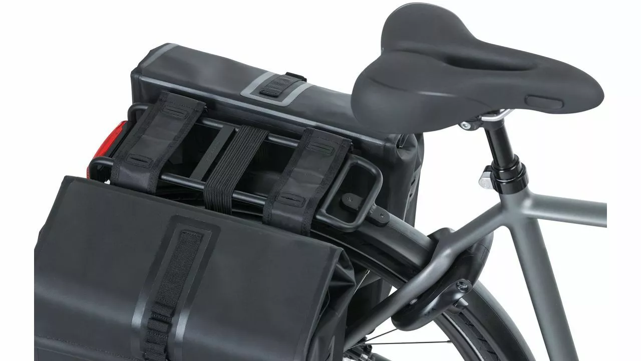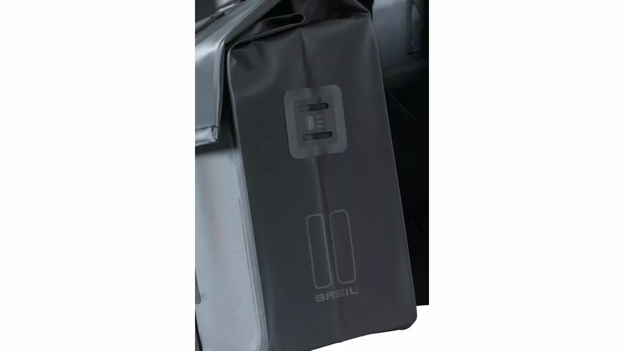In der Doppelpacktasche Urban Dry von BASIL vereinen sich mehrere praktische Eigenschaften. So ist die Tasche wasserdicht und hat einen Gesamtinhalt von 50 l. Somit gibt es genug Platz für Einkäufe, auch einer ausgedehnten Shoppingtour steht mit dieser Tasche nichts im Weg. <br><br>Das BASIL Universal Bridge System sorgt dafür, dass die Tasche auf diverse Gepäckträger (auch von E-Bikes) passt. Ebenfalls lässt sie sich mit Racktime-, i-Rack- und Carrymore-Platten kombinieren.<br>Das ist noch nicht alles: Die doppelte Fahrradtasche verfügt über einen verstellbaren Faltverschluss. Zudem ist man durch die Reflektorseiten bei Dunkelheit besser sichtbar. <br><br>Auch an die Beleuchtung wurde gedacht. So sorgt die Möglichkeit, LED-Beleuchtung zu befestigen, für bessere Sichtbarkeit und damit Sicherheit. Die geschweißten Nähte der Tasche und ihr Tarpaulin machen die Urban Dry wasserdicht. Somit ist ein Regenschauer keine Ausrede mehr, nicht ins Fitnessstudio zu gehen.