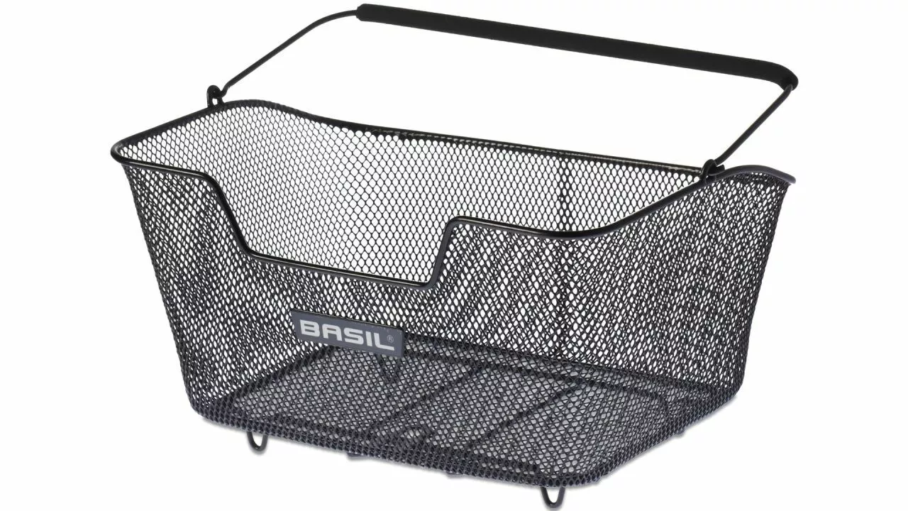 Der Base von BASIL ist ein praktischer schwarzer Fahrradkorb für den Fahrradgepäckträger. Mit Hilfe des praktischen Bügels kann man den Korb überallhin mitnehmen. Auf diese Weise wird das Einkaufen oder ein Marktbesuch einfacher und schöner. <br><br>Auf der Unterseite gibt es Aussparungen für die Federklappe des Gepäckträgers. Somit kann man den Fahrradkorb mit Hilfe der Federklappe und Haken unter dem Korb leicht von dem Gepäckträger lösen und ebenso wieder festmachen. Ferner sorgen die Haken unter dem Korb dafür, dass der Korb für diverse Gepäckträger geeignet ist. Die Standfüße dieses BASIL-Korbes wirken Beschädigungen am Korb entgegen. Zur Vermeidung von Diebstahl gibt es die Möglichkeit, ein Schloss am Korb zu befestigen. <br><br>Der Korb ist aus engmaschigem Stahl gefertigt. Er ist in einem mittleren (M), einem großen (L) sowie einem extra großen Format (XL) erhältlich. So oder so ist Platz für einiges an Einkäufen oder für andere tägliche Bedarfsgegenstände. <br>Man bringt diesen Korb der Breite nach auf dem Gepäckträger an.