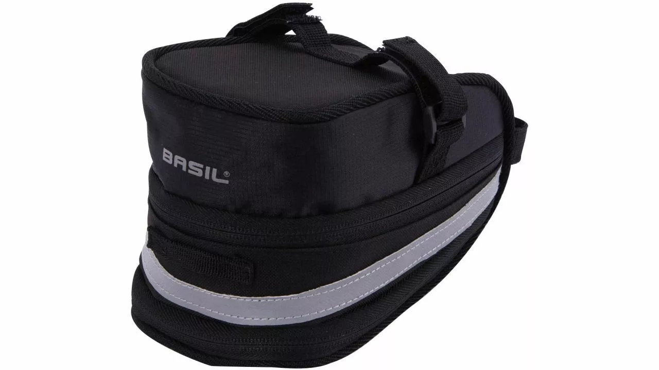 Bei der Mada von BASIL handelt es sich um eine schwarze Satteltasche in einer sportlichen und trendigen Ausführung. Die Satteltasche ist eine optimale Lösung für Fahrradliebhaber und das Verstauen eines Reifenreparatursets.<br><br>Wer gerne in der Natur Rad fährt, für den wird sich diese Satteltasche als unentbehrlich herausstellen. Mit einem Inhalt von einem Liter ist die Tasche perfekt, um Fahrradwerkzeug unterzubringen. Das ist sehr praktisch, wenn man unterwegs einen platten Reifen bekommt. Die Praktikabilität gilt natürlich auch für die tägliche Fahrradfahrt zur Arbeit. Dank des Extra-Vergrößerungsfachs lässt sich noch einiges mehr an Fahrrad-Accessoires mitnehmen. <br><br>Die Satteltasche ist aus wasserabweisendem 660D Polyester gefertigt und somit spritzwasserdicht. Man befestigt sie mit Hilfe von Klettverschluss und Clipverschlüssen am Sattel. Der Reflektorstreifen sorgt dafür, dass man auch abends gut für andere Verkehrsteilnehmer sichtbar ist. Trotzdem sollte man natürlich stets an angemessene Fahrradbeleuchtung denken. <br><br>Wer sich eine qualitative und trendige Satteltasche für den Sattel seines Fahrrads wünscht, findet in der BASIL Mada das genau Richtige für sich.