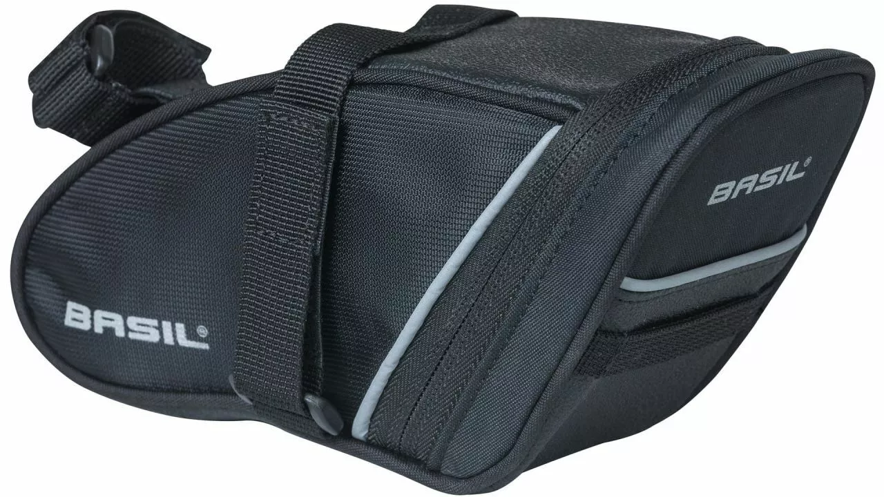 Perfekt für alle Radsportler ist die Satteltasche Sport Design von BASIL. Mit ihrem Volumen von exakt einem Liter ist sie sehr kompakt, bietet aber genügend Platz für ein nützliches Multi Tool. Das Hauptfach ist mit einem Innennetz und Karabinerhaken ausgestattet, an dem du deine Schlüssel fest machen kannst. <br><br>Für die Montage der aus wasserabweisendem Polyester gefertigten Tasche benötigst du nicht mal Werkzeug. Sie lässt sich nämlich mit einem Klettverschluss einfach an der Sattelstütze befestigen. Die reflektierenden Elemente sorgen dafür, dass du im Dunkeln oder bei Dämmerung besser auffällst. Außerdem bietet ein Riemen eine zusätzliche Befestigungsmöglichkeit für eine LED-Leuchte.