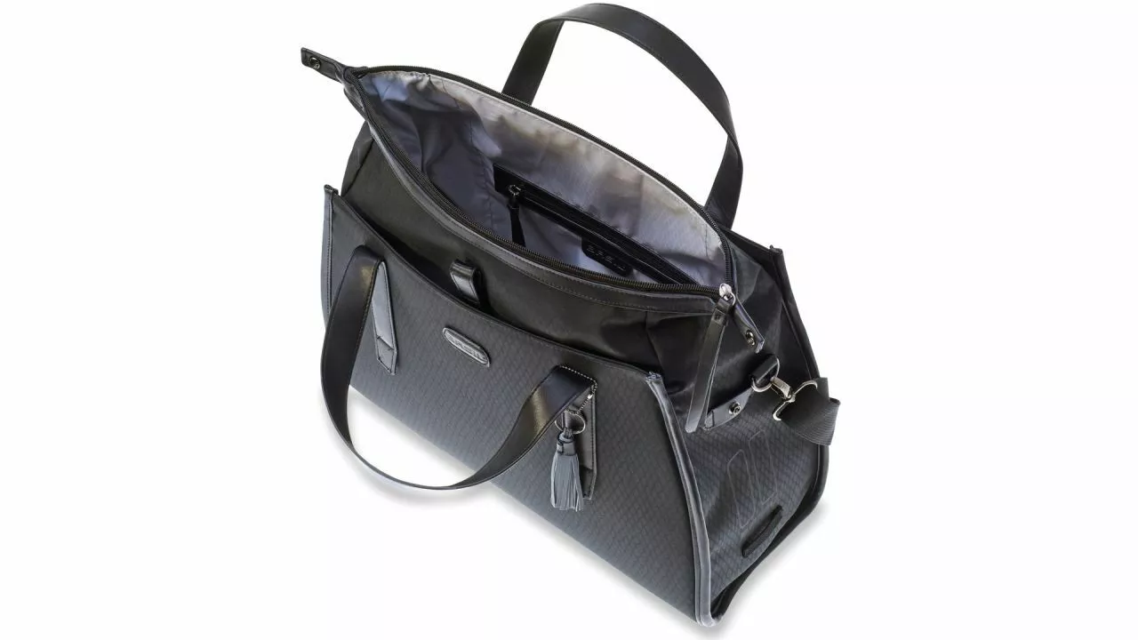 Bei der Noir Business Bag handelt es sich um eine elegante schwarze Fahrrad-, Schulter- und Handtasche in einem. Ob man nun zum Büro oder zu einer Verabredung zum Mittagessen unterwegs ist: Diese Tasche macht die Fahrradfahrt schöner und einfacher. <br>Durch ihren Print in Cobra-Optik und ihre veganen Lederdetails präsentiert man sich mit dieser Tasche stilvoll, ob man nun einen eleganten Look oder einen Business-Look anstrebt.<br><br>Ist Regen vorhergesagt? Kein Problem! Diese Business-Tasche ist wasserdicht, wodurch Ihre Habseligkeiten trocken bleiben.<br>Der Inhalt der Tasche beträgt 17 l. Sie verfügt über einen Rollverschluss mit Reißverschluss und mehreren Fächern. Es gibt ein Vorderfach und ein Reißverschlussfach auf der Innenseite, damit man seine Sachen übersichtlich aufbewahren kann. <br><br>Dank des Handgriffs und des abnehmbaren Schultergurts kann man die Tasche als Schulter-, aber auch als Handtasche benutzen. Das Hook-On-System sorgt dafür, dass die Tasche leicht an den Gepäckträger anzubringen ist. Dieses System wird auf sorgfältige Weise mit Hilfe einer abschließbaren Klappe verdeckt. <br>Für den Fall, dass Sie bei Dunkelheit nach Hause fahren wollen, sorgen die Reflektordetails und die reflektierende Quaste der Tasche dafür, dass Sie besser zu sehen sind. Es gibt ebenfalls eine Möglichkeit zur Befestigung von LED-Beleuchtung.