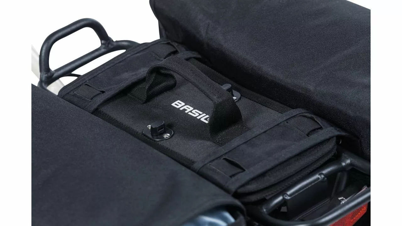 Beim BASIL DBS Detachable Bag System handelt es sich um ein praktisches System, mit dem man seine doppelte Fahrradtasche schnell und einfach auf dem Gepäckträger befestigen kann. Ebenso schnell können Sie die doppelte Fahrradtasche auch wieder abnehmen und als Tragetasche, zum Beispiel zum Einkaufen, mitnehmen. <br><br>Das Detachable Bag System besteht aus 2 Platten, die man einmalig mit Riemen an der Tasche (Platte 1) und einmalig am Gepäckträger (Platte 2) befestigt. Künftig befestigen Sie die Tasche dann mit einer kleinen Viertelumdrehung an den Drehverschlüssen auf dem Gepäckträger. Und fest sitzt die Tasche! Genauso einfach lässt sich die Tasche auch wieder abnehmen. Ein kurzer Dreh und die Fahrradtasche wird zur Tragetasche. <br>Das Befestigungssystem passt für alle BASIL-Taschen mit einem Universal Bridge System. Das innovative System ist in schwarzer Ausführung erhältlich.