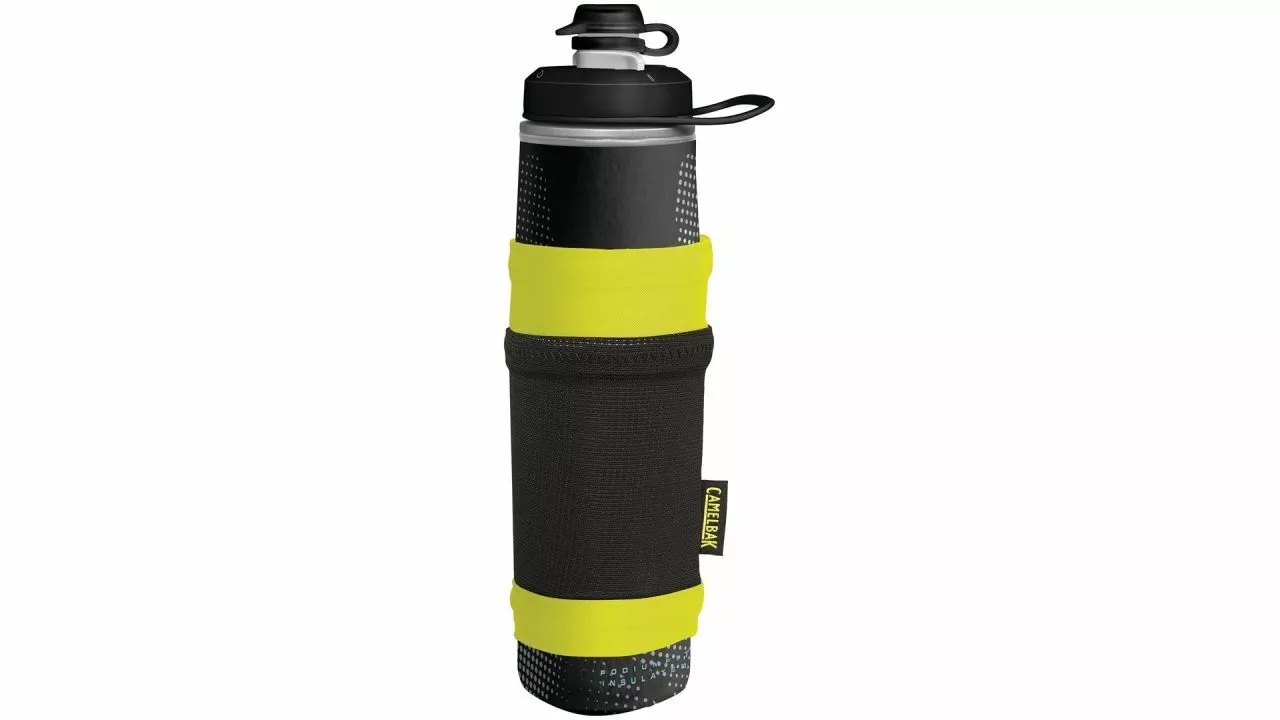 Die CAMELBAK Trinkflasche Peak Fitness Chill Essential ist dein optimaler Begleiter im Fitnessstudio. Dank der Doppelwand-Isolierung hält sie Flüssigkeiten zweimal länger kalt als herkömmliche Trinkflaschen, laut Hersteller. An der Trageschlaufe kannst du sie einfach von Gerät zu Gerät im Studio mitnehmen. Die Textilhülle ist mit einer kleinen Tasche ausgestattet, in der Platz für Schlüssel oder Kleingeld ist. <br><br>Durst nach schweißtreibendem Training? Der große Ventildurchmesser des selbstverdichtenden Mundstücks maximiert den Durchfluss. Die Lock-out-Funktion verspricht tropffreien Transport. Ergänzt mit einer Mud Cap kann kein Schmutz an das Mundstück der Flasche gelangen.<br><br>CAMELBAK fertigt die 710 ml fassenden Peak Fitness Chill Essential aus Polypropylen. Dieser Kunststoff ist sowohl geruchs- und geschmacksneutral als auch frei Weichmachern. Der Korpus ist ergonomisch geformt. <br><br>Damit die Flasche in schlankem Design auch nach Gebrauch optimal gereinigt werden kann, besteht der Deckel aus mehreren Einzelteilen. Außerdem passt die Trinkflasche in nahezu allen gängigen Flaschenhalter.