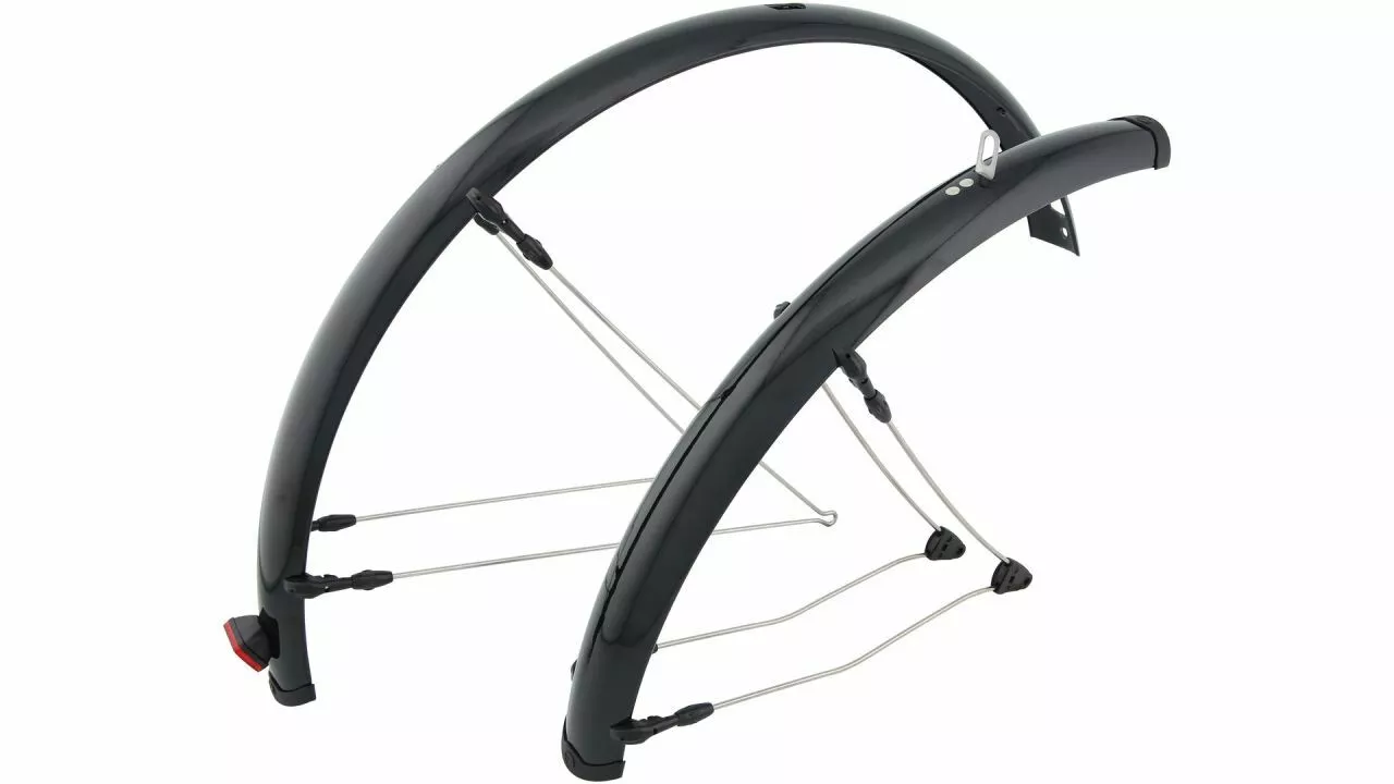 Mit Schutzblechen fährt es sich insbesondere im Regen deutlich angenehmer. Diese Radschutzgarnitur von CONTEC besteht aus Kunststoff. Dazu gehören je 2 Edelstahl-Festbrücken. Befestigt werden die Schutzbleche mit 2 V-Streben, sowohl am Vorderrad als auch am Hinterrad. Zu den Befestigungsteilen gehören ebenfalls Safe Clips für innen und außen sowie 2 Winkel für die Gabelbefestigung.<br><br>Das Strebenschutzblech ist in verschiedenen Größen und sowohl für Batteriekabel, Discbremsen als auch Disc-Rahmenakkus erhältlich. Das perfekte Anbauteil, um beim Radfahren auf Dauer sauber zu bleiben.