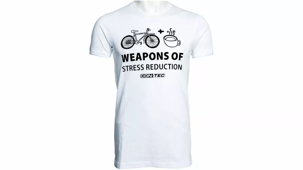 Erstmal 'n Kaffee und dann ab aufs Bike – oder andersrum? Egal, Hauptsache beides, denn Biken und Kaffeetrinken sind die besten Mittel gegen Stress, meint CONTEC. Mit schwarz-weißem Print haben sie ein cooles und nachhaltiges Unisex T-Shirt im Portfolio, das dich im Alltag beim Kaffeetrinken, auf dem Bike oder einfach nur dann, wenn du Lust hast, es zu tragen, begleitet.<br><br>Da das Stress Reduction Shirt aus 100 % Bio-Baumwolle gefertigt ist, fühlt es sich herrlich weich auf deiner Haut an und reduziert dazu auch ihren Stress. Das Material enthält nämlich kaum Zusatzstoffe, die deine Haut reizen können, und beim Anbau wird auf chemische Pestizide verzichtet, was weniger Stress für die Umwelt bedeutet. Mit Rundhalsausschnitt und Rollsäumen an Ärmeln und Hals hat das Stress Reduction Shirt also gute Chancen, auch deinen morgendlichen Stress zu reduzieren, wenn du dich mal wieder fragst, was du heute anziehen sollst.