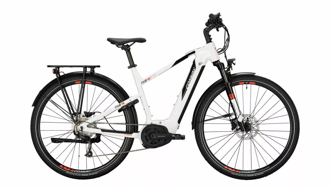 Das Cairon T 200 von CONWAY ist ein mehr als solider Einstieg fürs E-Bikefahren im Alltag und auf Tour. Auf den vielseitigen Einsatz ist das überarbeitete E-Bike Pedelec ausgerichtet. Dabei unterstützt der Elektro-Antrieb beim Pedalieren bis 25 km/h mit voller Kraft voraus der Performance Antrieb von Bosch beschleunigt kräftig!<br><br>Dazu erhält der Antrieb seine Energie aus dem 625 Wh PowerTube-Akku, den das Cairon T 200 elegant in den Unterrohr integriert. Und über den sich der Akku einfach aus dem Rad entnehmen lässt. Mit dem darunter platzierten Motor wirkt das Cairon T 200 mehr wie ein kräftiges Tourenrad oder eben wie ein modernes Trekking-Pedelec, das sich auf die Integration seiner Teile versteht. So bilden auch der Gepäckträger und das hintere Schutzblech eine Einheit die obere Haltestrebe des Trägers verläuft unter dem Schutzblech von SKS, hält es so mit und sorgt nebenbei für die aufgeräumte Optik des gesamten Rads. Seiner Hauptaufgabe wird der Gepäckträger natürlich ebenso gerecht, indem er Packtaschen für Touren, den Ausflug zum Badesee oder die Einkäufe ganz stabil mitnimmt.<br><br>Beim Antrieb hilft der 1×9-fach Kettenschaltungs-Antrieb von Shimano, und beim punktgenauen Abbremsen die überaus zuverlässigen BR-MT200 hydraulischen Scheibenbremsen, ebenfalls von Shimano. Nicht zuletzt sind die 50 mm breiten Schwalbe Energizer Active Plus Reifen extra für solch zuverlässige Einsteiger-Pedelecs wie das Cairon T 200 gemacht.