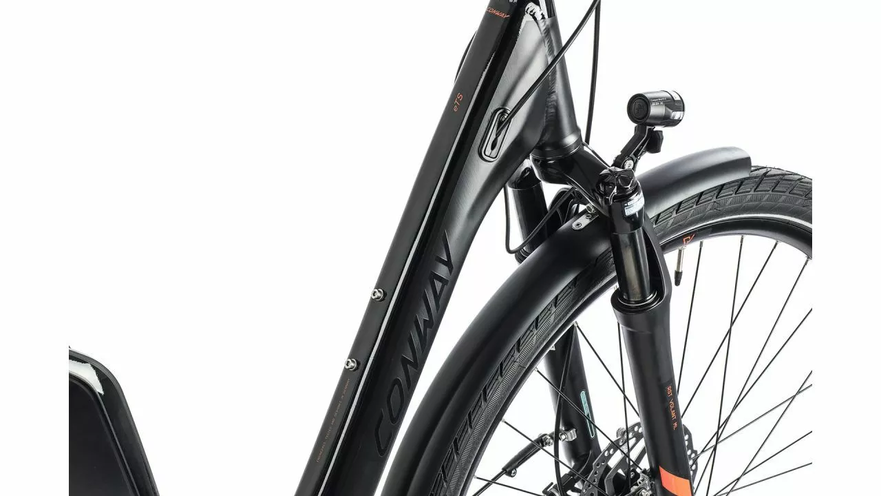 Die neue eTS-Modellreihe ist die erste vollständige Trekking-Serie von CONWAY. Neben den verschiedenen Ausstattungsvarianten gibt es 3 verschiedene Rahmenformen in allen gängigen Rahmengrößen. Für Männer gibt es einen klassischen Diamantrahmen mit waagerechtem Oberrohr. Frauen können sich zwischen einer sportlicheren Trapezform oder einem Tiefeinsteiger wählen. <br><br>Der mattschwarze Rahmen mit den orangefarbenen Akzenten verleihen dem Trekkingrad einen schicken und modernen Look. <br><br>Das Herzstück des eTS 300 ist der Bosch-Motor. Durch eine Leistung von 250 W und 63 Nm Drehmoment bringt einen der Performance Line-Motor jeden Anstieg locker hoch. Damit werden auch große Distanzen mit wenig Kraftaufwand bewältigt. Um in die Gänge zu kommen hilft ein bewährtes Shimano-Deore-Schaltwerk mit 9 Gängen. <br><br>Gerade für lange Touren ist ein gewisser Komfort unerlässlich. Dafür sorgt beim eTS 300 eine RST-Volant-Federgabel mit 63 mm Federweg. Diese federt Schläge und Stöße zuverlässig ab. <br><br>In der Dunkelheit erhellt ein Scheinwerfer von Axa mit einer Lichtleistung von 35 Lux den Fahrradweg. Mit dieser Lichtanlage wird man nicht nur gesehen, sondern sieht auch selber alles, was einem in die Quere kommt.<br><br>Natürlich gehören zu einem Citybike auch Schutzbleche die vor Spritzwasser schützen. Außerdem ist mit einem Gepäckträger auch für das nötige Packvolumen gesorgt, um einkaufen zu fahren oder ein Picknick im Grünen zu machen.<br><br>Im urbanen Gebrauch ist das Rad für alle möglichen Situationen gerüstet. Ob Pendeln, Einkaufen oder einfach nur, um zu Cruisen: Das eTS 300 ist dabei.