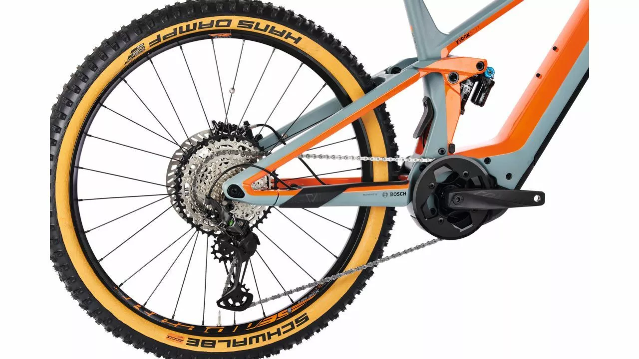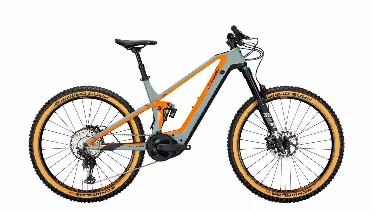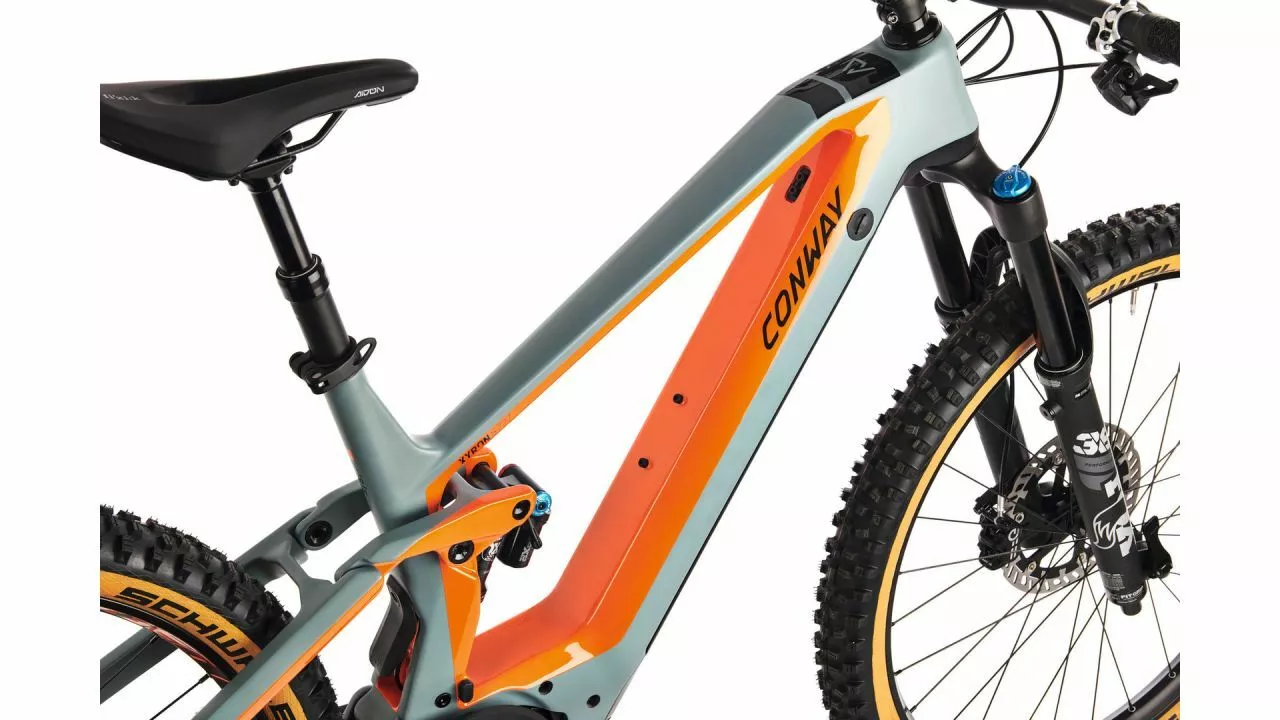 Das Xyron 727 Carbon von CONWAY ist der Einstieg in die E-Fully-Oberklasse. Es ist leichter als die robusten Alu-Kollegen, sein Rahmen enorm verwindungssteif und wie die ganze neue Xyron-Serie wie aus einem Guss konzipiert. Der Rahmen ist vollständig aus Carbon gefertigt, nicht nur Hauptrahmen und Hinterbau, sondern auch die Wippe. Die vollständig im Rahmen integrierten Züge und die von außen unsichtbaren Lagerungen sind nur zwei Details der sinnvollen Systemintegration.<br><br>Das offensichtlichste Merkmal sieht man gar nicht: der Bosch PowerTube-Akku mit reichweitenstarken 625 Wattstunden ist eben im Unterrohr integriert, und der bullig-starke Bosch Performance CX-Motor ebenso im Tretlagerbereich ganz natürlich in die Gesamtsilhouette eingebunden.<br><br>Dieses Gesamtkonzept bringt ein E-All Mountain hervor, das mit seinen Allround-Eigenschaften bergauf und bergab glänzt und auch auf den Trails zwischen den Bergen. Bergauf profitiert das Bike neben dem stärksten Bosch-Antrieb vom ebenfalls kletterfreudigen SRAM Eagle 1×12-fach Antrieb. Bergab spielen das Fahrwerk mit Fox Performance 36 Float-Gabel mit 150 mm Federweg und dem Fox Float DPS Dämpfer und die Schwalbe-Reifen bestens zusammen. Vorne rollt das Xyron 727 Carbon auf den Schwalbe Magic Mary mit Snakeskin Seitenwand und hinten mit Schwalbe Hans Dampf mit Speedgrip Compound, jeweils in 65 mm Breite.<br><br>Mit dem 780 mm breiten Lenker lässt sich das Xyron 727 filigran steuern, und mit der CONTEC Drop-A-Gogo absenkbaren Sattelstütze gibt es auch bergauf und bergab die jeweils passende Sitzposition auf dem E-Allmountain-Allrounder.