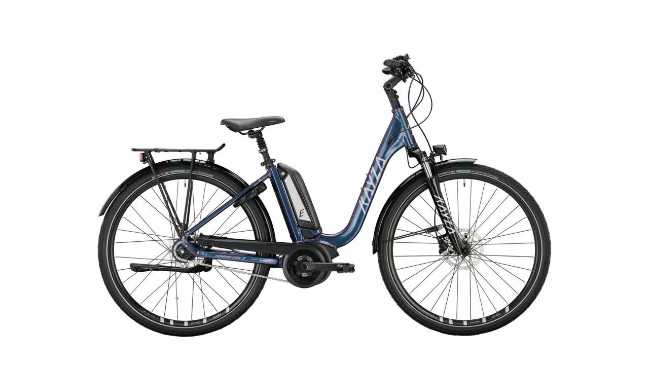 Tanana bedeutet in der indigenen Sprachfamilie Nordamerikas Gebirgsfluss – und wie so ein Gebirgsfluss kannst du dich auch mit KAYZAs Tanana Dry 3 durch hügeliges Terrain schlängeln. Für die richtige Fließgeschwindigkeit treibt dich der harmonische Active Plus BOSCH-Motor dabei mit bis zu 25 km/h voran. Gespeist wird er vom 400-Wh-Akku, der für den tiefen Schwerpunkt am Sitzrohr seinen Platz findet.<br><br>Komfortorientiert ist das E-Trekkingrad von Beginn an mit seinem Wave-Rahmen und dem tiefen Durchstieg. Sitzt du erstmal, nimmst du automatisch eine aufrechte Sitzposition ein, die von der Geometrie vorgegeben wird. Fürs Feintuning kannst du den winkelverstellbaren Vorbau leicht anpassen – ganz wie es dir beliebt.<br><br>Für noch mehr Komfort ist das E-Bike mit einer Federgabel von SUNTOUR ausgerüstet. Sie lässt sich ganz individuell aufs Fahrergewicht einstellen – dann trägt sie ihr bestmögliches dazu bei, Offroad- wie Kopfsteinpflaster-Unebenheiten glattzubügeln. Ebenso funktionieren die Reifen sowohl auf Asphalt oder Kopfsteinpflaster als auch auf Feldwegen. Ob nun in der Stadt oder auf langen Abfahrten unterwegs – die hydraulischen Scheibenbremsen BR-MT 200 von SHIMANO packen auch bei Nässe kräftig zu und lassen sich jederzeit leichtgängig bedienen. Hinzu kommt die Rücktrittbremse.<br><br>Mit langen Schutzblechen, Klingel und dem Gepäckträger sowie allen Reflektoren und dem hellen LED-Licht wird das Tanana Dry 3 vollends alltagstauglich. Die Tourentauglichkeit wird durch die SHIMANO Nexus Kettenschaltung komplettiert, die mit ihren 8 Gängen auch für hügeliges Terrain eine solide Bandbreite parat hält.
