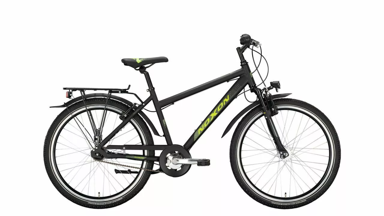 Das Sweeper FG ND von NOXON hat alles, was ein anständiges Jugendrad so braucht: eine moderne Form, mit der sich der Bike-Nachwuchs gerne zeigen kann und die eine angenehme Haltung und damit den Überblick im Straßenverkehr vorgibt. Eine praktische und komplette Ausstattung, die der Gesetzgeber vorschreibt. Und eine Vielzahl an Rahmenhöhen, die genau passen.<br><br>Beim Sweeper FG ND haben die Nachwuchspiloten dazu die Wahl zwischen einem klassischen Diamantrahmen mit großer Überstandshöhe und einem Banana-Y-Rahmen. Es rollt auf 26''-Laufrädern und ist in gleich in fünf Rahmenhöhen erhältlich: 38 cm, 40 cm, 45 cm, 50 cm und 55 cm.<br><br>Dazu gibt es die Wahl zwischen einer 7-Gang-Nabenschaltung und einer 3×7-Gang Kettenschaltung, jeweils von Shimano. Das FG im Modellnamen steht für Federgabel, die gemeinsam mit den 50 mm breiten Reifen gut den Boden einebnet und dämpft. Das ND wiederum weist auf den Nabendynamo hin, der den LED-Scheinwerfer und das Rücklicht mit Standlichtfunktion speist. Praktisch im Alltag ist dazu der Gepäckträger. Er lässt sich für die sportliche Ausfahrt aber auch und genau wie die Schutzbleche mit wenigen Handgriffen abnehmen – noch so eine Option für ein anständiges Jugendrad.
