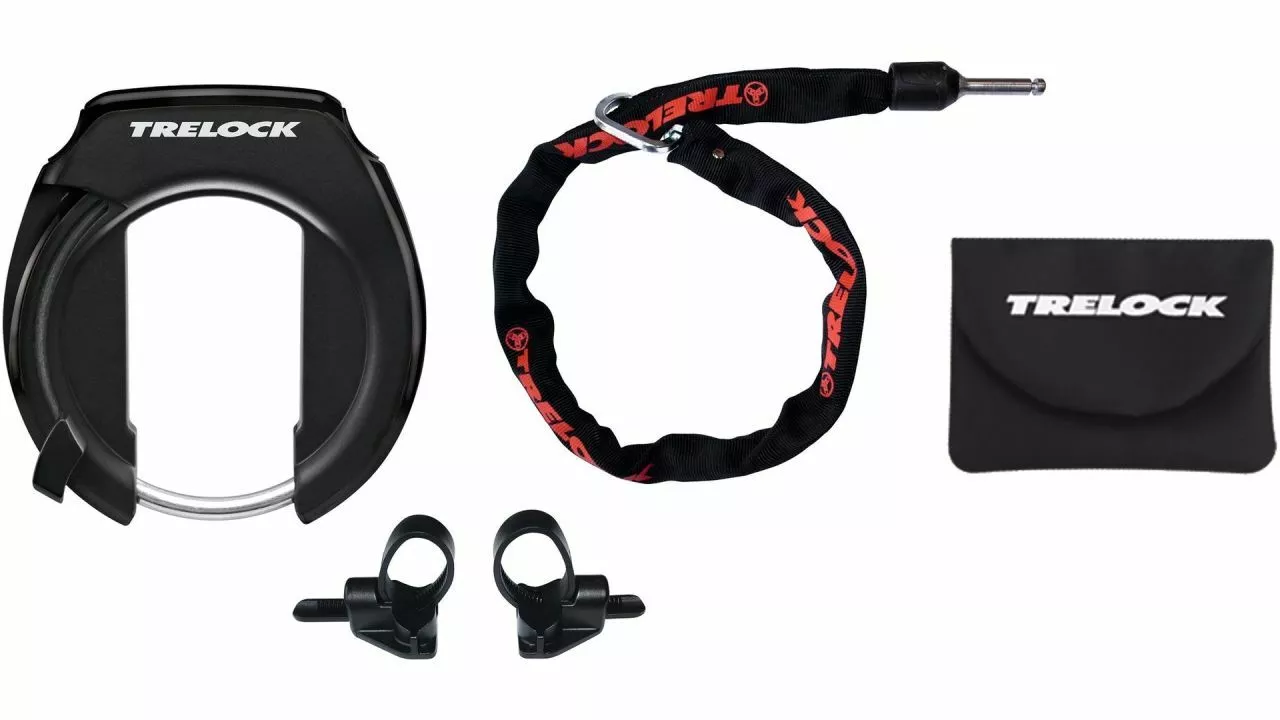 Zum schnellen Abschließen des Fahrrads vorm Bäcker eignet sich ein Rahmenschloss schon mal gut. Besser ist es noch, wenn das Fahrrad richtig an einem festen Gegenstand angeschlossen wird. Das ist beim Rahmenschloss-Set RS 351 Kombi von TRELOCK beides der Fall. <br>Das Rahmenschloss erreicht Sicherheitsstufe 3 auf TRELOCKs eigener Skala von 1 bis 6. Für die Sicherheit sorgt der stabile Schlosskörper und der PLC-Schließzylinder, der per Wendeschlüssel bedient wird. Es ist auch als Variante für Ballonreifen erhältlich. <br>Zusätzlich bietet die Anschlusskette ZR 355 Sicherheit beim Anschließen. Sie sichert das Fahrrad, indem man sie als Schlaufe um einen festen Gegenstand legt. Ihr Bolzen am Ende wird dann in das Rahmenschloss gesteckt und mit abgeschlossen. Die ZR 355 besteht aus 6 mm dicken Kettengliedern, die als Schlagschutz fest ummantelt sind. Die Anschlusskette ist kompatibel mit zahlreichen Rahmenschlössern von TRELOCK und in vielen Farben erhältlich.