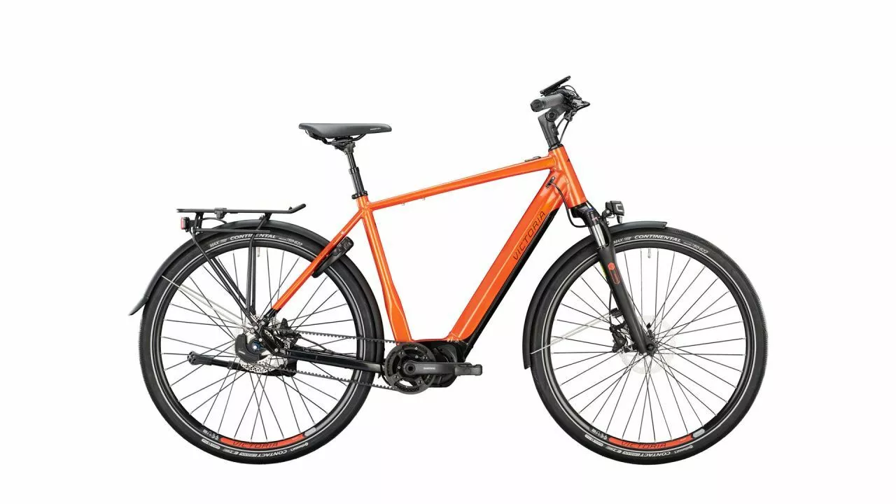 Pendler oder Cityhopper, Genuss-Tourer oder sportlich ambitioniert – ganz egal: Das eTouring 11.9 ist ein Allround-Talent, das für sämtliche Ansprüche eine Lösung parat hat. Modern ist es zudem auch in Optik und Technik: der zweifarbige Look mit der Farbe sunburned orange als auch der SHIMANO STEPS E6100 Mittelmotor sind ein echtes Statement. Als Energiespender fungiert hier der 630-Wh-Akku – die reichweitenstärkste und vollintegrierte Version, prädestiniert für ausgedehnte Wochenend-Touren. Dadurch und in Kombination mit dem reduzierten Marken-Schriftzug schenkt VICTORIA dem eTouring 11.9 ein aufgeräumtes, cleanes aber auch sportliches Äußeres.<br><br>Wartungsarm – und damit auch optimal für AlltagsfahrerInnen geeignet – ist das E-Bike durch den Riemenantrieb. Der GATES CDX Riemen ist besonders wartungsarm und muss nur ab und an mit Wasser gesäubert werden. So kommt man immer mit sauberen Hosenbeinen am Ziel an.<br><br>Geschaltet wird per elektronischer SHIMANO Nexus 5-Gang Di2 mit Leerlaufnabe. Auch hier besticht unter anderem der geringe Wartungsaufwand, denn es gibt keine Schaltzüge, die gewechselt werden müssen. Damit man sich entweder voll und ganz auf den Berufsverkehr konzentrieren oder auf Touren den Blick entspannt in die Ferne schweifen lassen kann, lässt sich die Gangschaltung vollautomatisch bedienen. Wer das nicht möchte, kann die Gänge aber auch manuell durchschalten.<br><br>Fein dosierbar oder spontan kräftig – auf jeden Fall immer verlässlich: Dafür sind die hydraulischen Scheibenbremsen von SHIMANO da. Sie sorgen für das nötige Maß an Sicherheit, auch wenn es nass ist. Komfortabel wird es auf dem eTouring 11.9 aus der Kombination von gefederter Sattelstütze und den 50 mm breiten Reifen von CONTINENTAL. Auch die Gabel ist gefedert. Für Fahrten in der Ebene oder bergan, lässt sie sich sogar blockieren.<br><br>Der MIK-Systemträger nimmt es letztendendes mit allen gängigen Taschen auf, die über ein entsprechendes Klick-System verfügen – ganz egal, ob es eine Commuter-Tasche fürs Büro oder vollbeladene Reisetaschen sind. Einzige Begrenzung: 25 kg maximal.