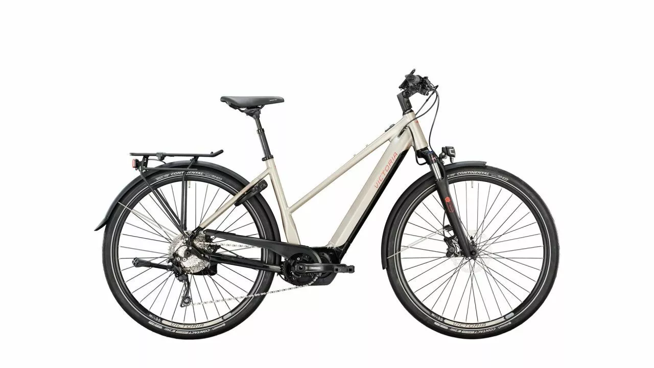 Das eTouring 12.8 ist der optimale Gefährte, wenn es nach Feierabend nochmal eine Runde durch die Felder geht oder wochenends auf ausgiebige Touren. Der SHIMANO STEPS E7000 Motor schmiegt sich dank seiner flachen Bauart formschön in den Rahmen ein. In diesen ist auch der 504 Wh leistende InTube-Akku voll integriert. Die Optik wirkt aufgeräumt und modern – nicht zuletzt aufgrund des minimalistischen VICTORIA-Schriftzuges und des neuen zweifarbigen Designs.<br><br>Geschaltet wird per SHIMANO 10-fach Deore, die mit ihrer Übersetzung und Gangabstufung für steile Anstiege und schnelle Talfahrten konzipiert ist. Durch die Linkglide-Technologie lässt sie sich deutlich knackiger bedienen. Verschleiß macht sich langsamer bemerkbar. Starke Hydraulische Scheibenbremsen, ebenfalls vom japanischen Hersteller, sorgen bei genau solchen Szenarien für die richtige Sicherheit.<br><br>Wo Bodenunebenheiten zu erwarten sind, sorgen gefederte Komponenten für die Dämpfung. Beim eTouring 12.8 sind es die Sattelstütze und die Gabel. Letztere hat einen Federweg von 63 mm und lässt sich bei Bedarf blockieren. Die breiten CONTINENTAL Reifen unterstützen den Komfort-Aspekt, sorgen aufgrund ihres Profils aber auch für eine gute Traktion und Kurvengrip.<br><br>Für das Rundumsorglos-Paket ist das E-Bike mit einem MIK-Systemträger, sehr heller LED-Beleuchtung sowie Schutzblechen ausgerüstet. Damit ist das eTouring 12.8 nicht nur ein toller Touren-Gefährte, nein, er ist auch ein verlässlicher Partner, wenn es um kurze Strecken innerhalb der Stadt geht.